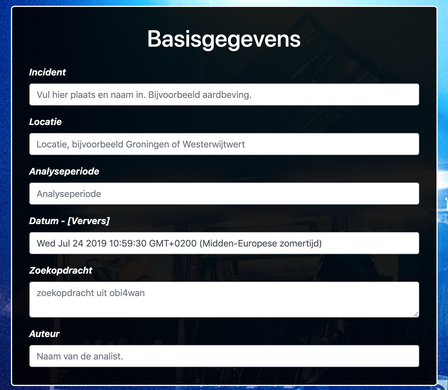 Een aantal basisgegevens zijn nodig om de context van de omgevingsanalyse duidelijk te maken. Denk hierbij aan het incient, de locatie en op welke periode de analyse betrekking heeft. Die kun je hier direct invullen.